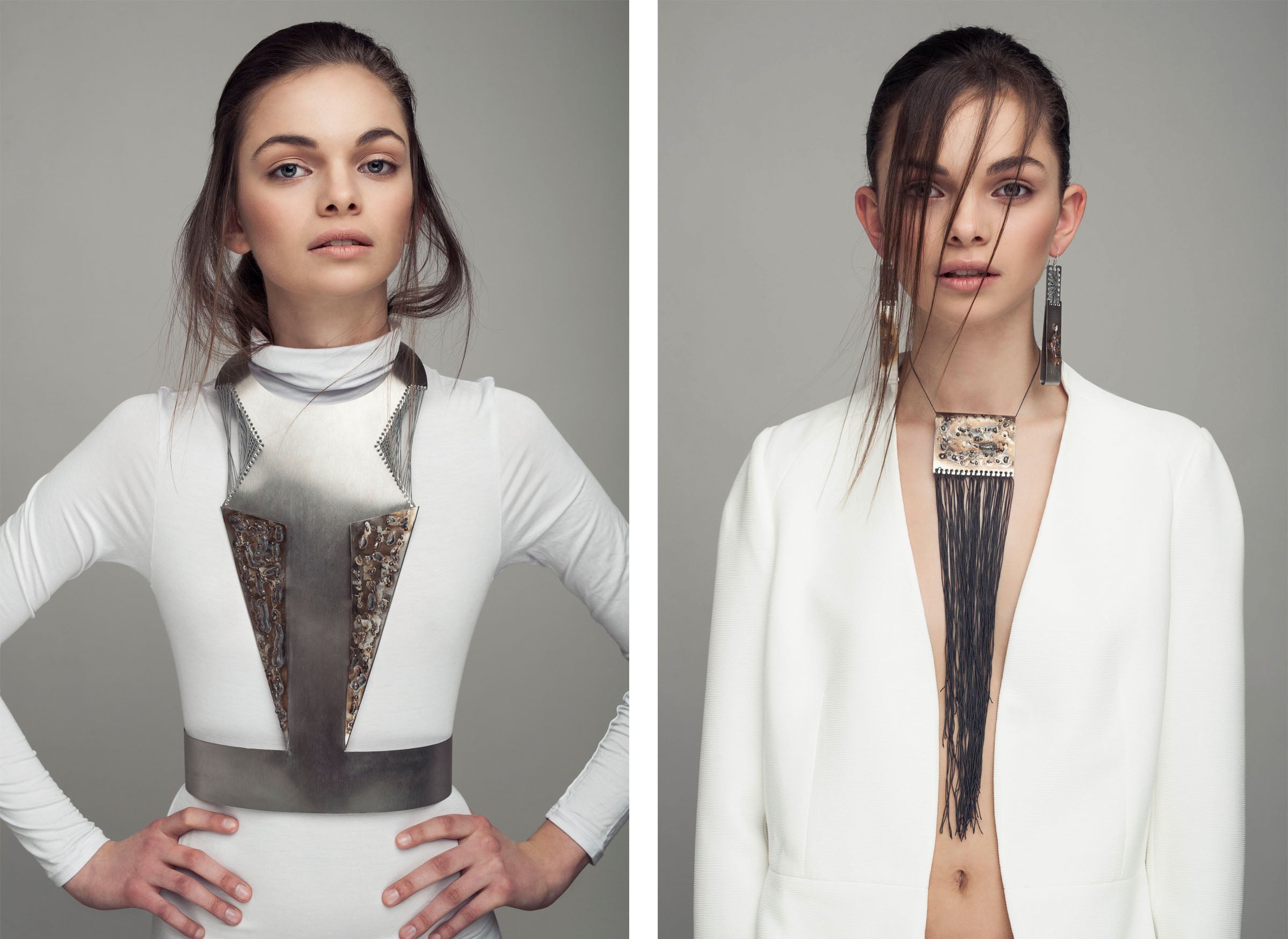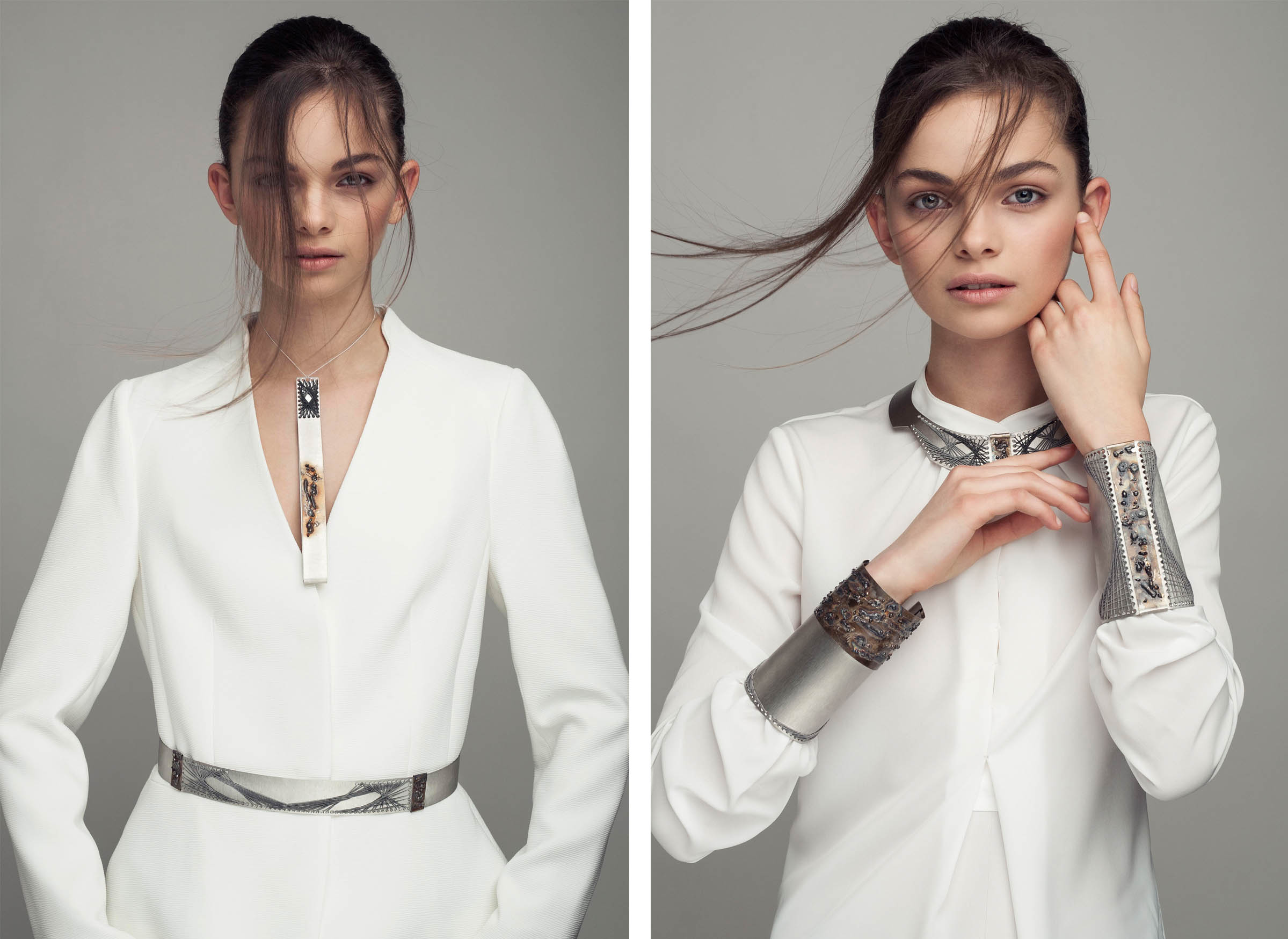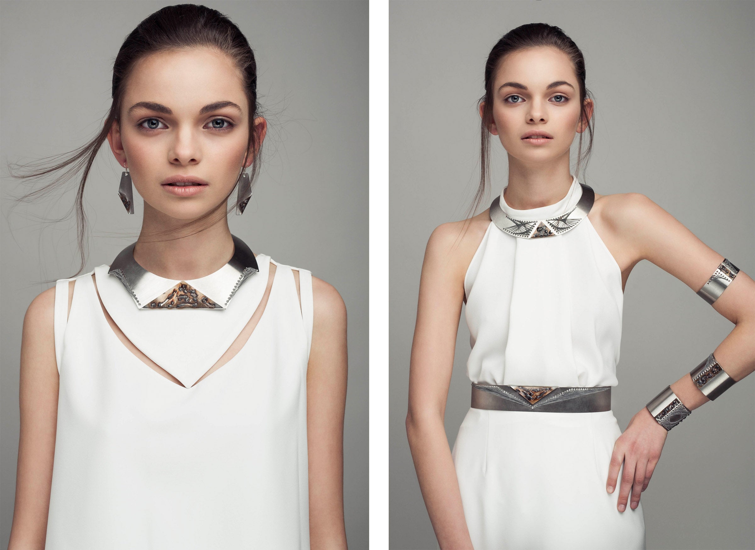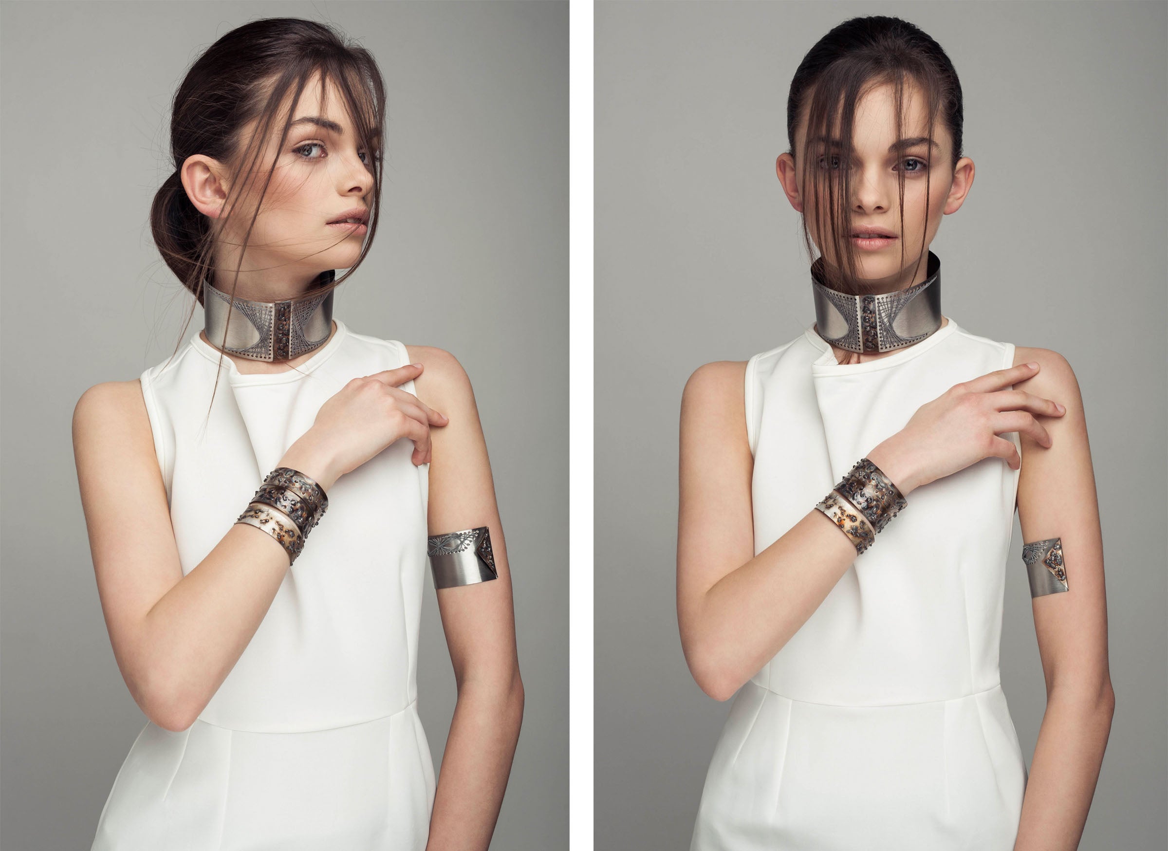 A tervező mindig is vonzódott a rozsdás és kopott felületekhez. Ebben a kollekcióban a „gesztus-hegesztett” textúrák szembekerülnek a letisztult, szálcsiszolt acéllal, ami különleges kontrasztot teremt. Az ékszereken megjelenő pántok a nyers ipari technológia segítségével jönnek létre, így az egymásra „csurgatott” anyagrétegek textúrái minden egyes darabon véletlenszerűen alakulnak ki. Távolról ugyan kissé ridegnek tűnhet ez a metódus, de alaposan szemügyre véve millió izgalmas részlet rejlik benne. Az új szezonban a nyakláncok, a nyakpántok, a fülbevalók és a karkötők mellett megjelennek az övek és a kézzel varrott táskák is.